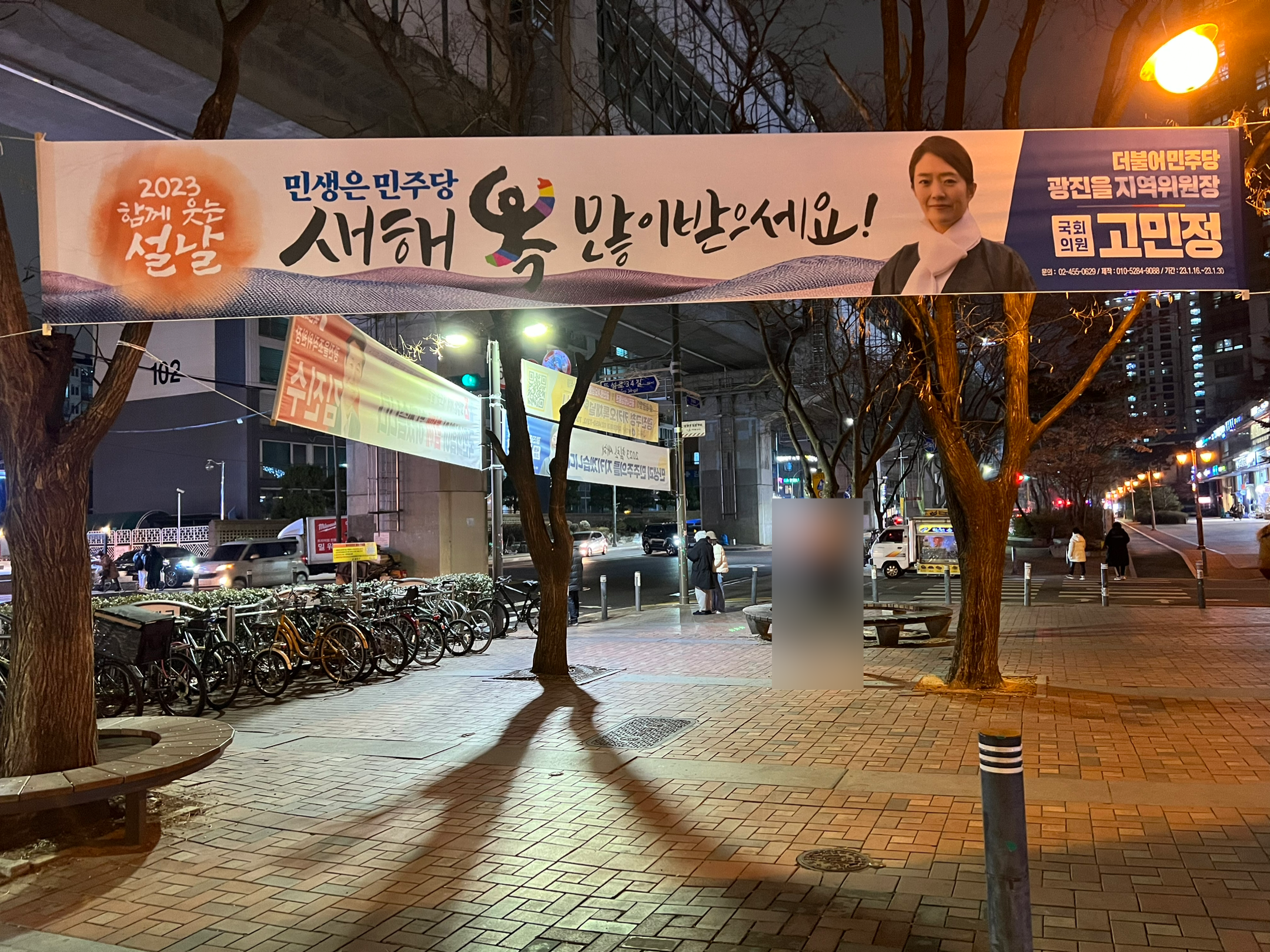 뚝섬유원지역 1번 출구 앞에는 늘 정치인들의 현수막이 지저분하게 걸려있습니다. 아름다운 유원지에 정치인 현수막이라뇨? 이건 명백한 시야 공해입니다.. 광진구는 고민정의원의 지역구라 그런지 더불어민주당의 현수막이 주를 이뤘는데 이번에는 국민의힘에서 현수막을 무려 두 개씩이나 게시했습니다. 광진을 당협위원장 김진수 의원의 현수막입니다. 현수막에는 개정된 옥외광고물법의 합법 요건인 1. 당명과 2. 전화번호 3. 설치업체 번호와 4. 게시 기간 이 표기되어 있습니다. 보기는 싫지만 일단은 합법적인 현수막입니다.. 현수막 내용을 볼까요? 왼쪽의 현수막에는 요즘 핫이슈인 이재명 대표를 겨냥한 듯한 말 같네요. ‘불체포특권’에 대한 언급이 있습니다. 다른 한 현수막에는 ‘국민의힘은 민생에 집중합니다’라는 내용이 쓰..