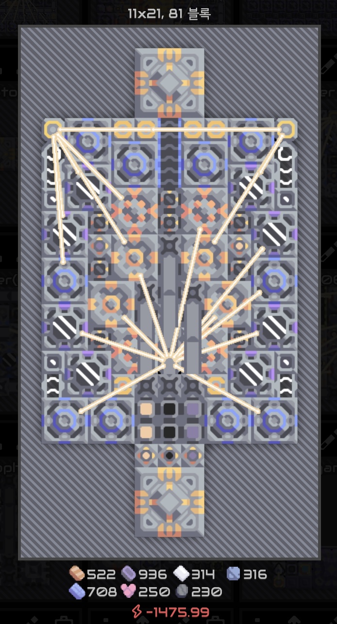 폭발물 혼합기는 폭발물을 생산하는데, 생산이 까다로운 파이라트이트와 포자를 재료로 사용합니다. 이 설계도에는 파이라타이트와 포자(심지어 포자에 필요한 물까지)의 생산 시설이 포함되어있어, 언로더가 연결된 창고로 납과 석탄, 모래만 넣어주면 되기에 폭발물을 만들때 아주 편리합니다. 참 대단한 설계도입니다. 단, 편리한 만큼 전력 소모는 심한편이에요. 약 1.5k/s의 전력을 소모합니다. 폭발물의 생산속도로 보아, 6개의 핵융합 원자로 정도는 가동에 문제가 없는 생산속도입니다. 설계도: bXNjaAF4nE1S7Y6bMBBcYwyGkHBR1b9V+wA8TB+BBHpCSiAlkFyeu+2P3kfcGTuXayJrdu3x7LIeWcjnSOK+3reSbIZh346yaNrjduwOUzf0IqWU53pqx6p9msZ6O..