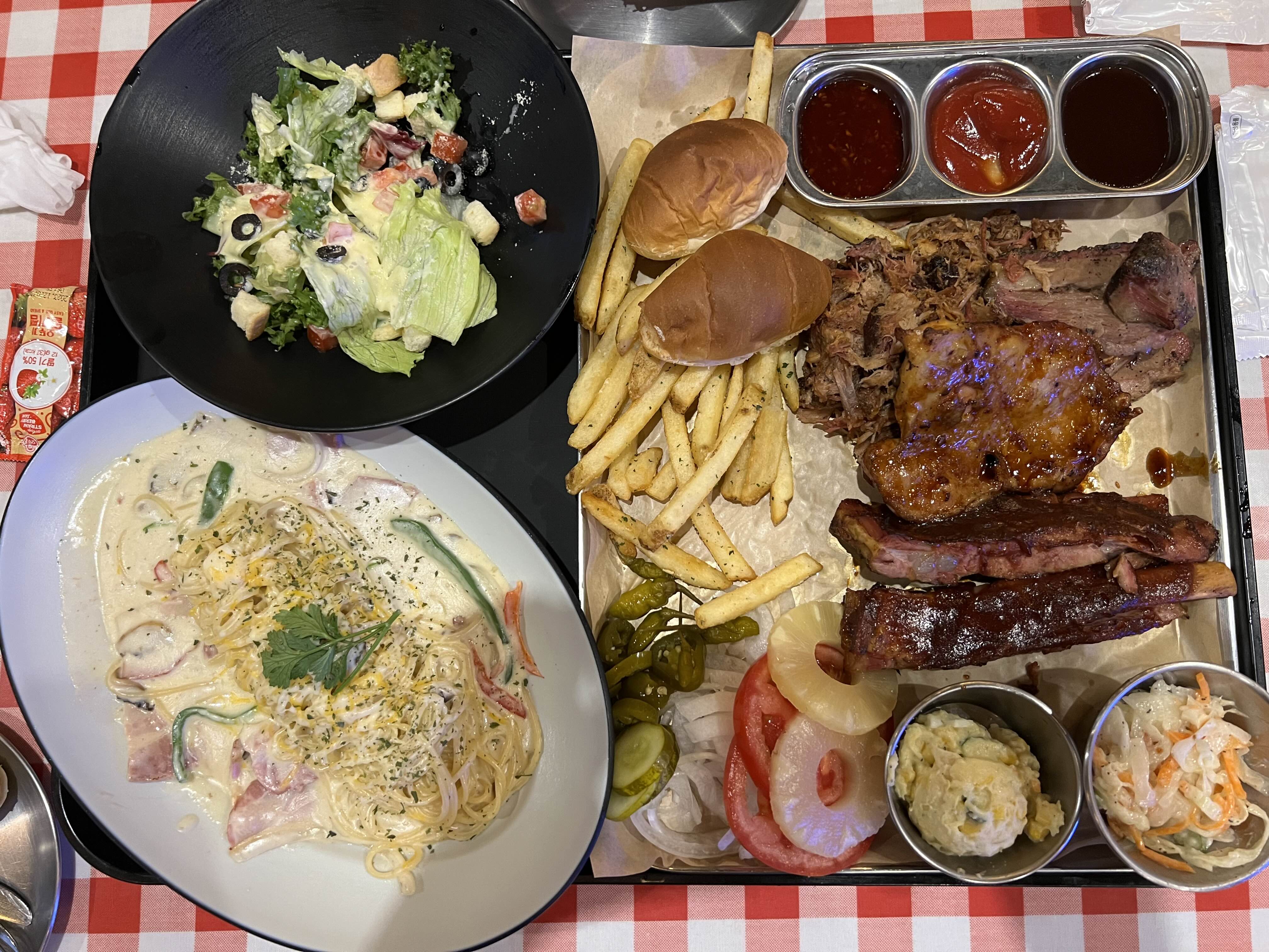 미국식 텍사스 바베큐 맛집 블루스모크! 이번에는 해가 진 시간에 다녀왔습니다. 이번이 몇 번째 방문이더라~? 방문횟수는 그만큼 블루스모크가 맛집이란 뜻이겠죠? 블루스모크에는 스테이크와 립, 스파게티, 피자, 샐러드 등 다양한 메뉴가 있는데 아기와 함께인 저희 3인 가족은 플래터 하나와 크림치즈파스타를 주문했습니다. 지난번에는 카운터에서 주문을 했었는데, 테이블마다 키오스크가 설치되었네요. 서빙로봇이 돌아다니는 최첨단 맛집입니다 ㅎㅎㅎ 블루스모크의 대표 메뉴인 텍사스 바베큐 플래터는 여러 종류가 있는데, 이번에는 포크립플래터 2인(69,000원)과 베이컨 크림스파게티(15,900원)를 주문했습니다. 커다란 립 2조각, 빵 4개, 빵 샐러드, 감자, 닭 봉, 바베큐 등등으로 구성되어 있습니다. 고기가 맛있다..